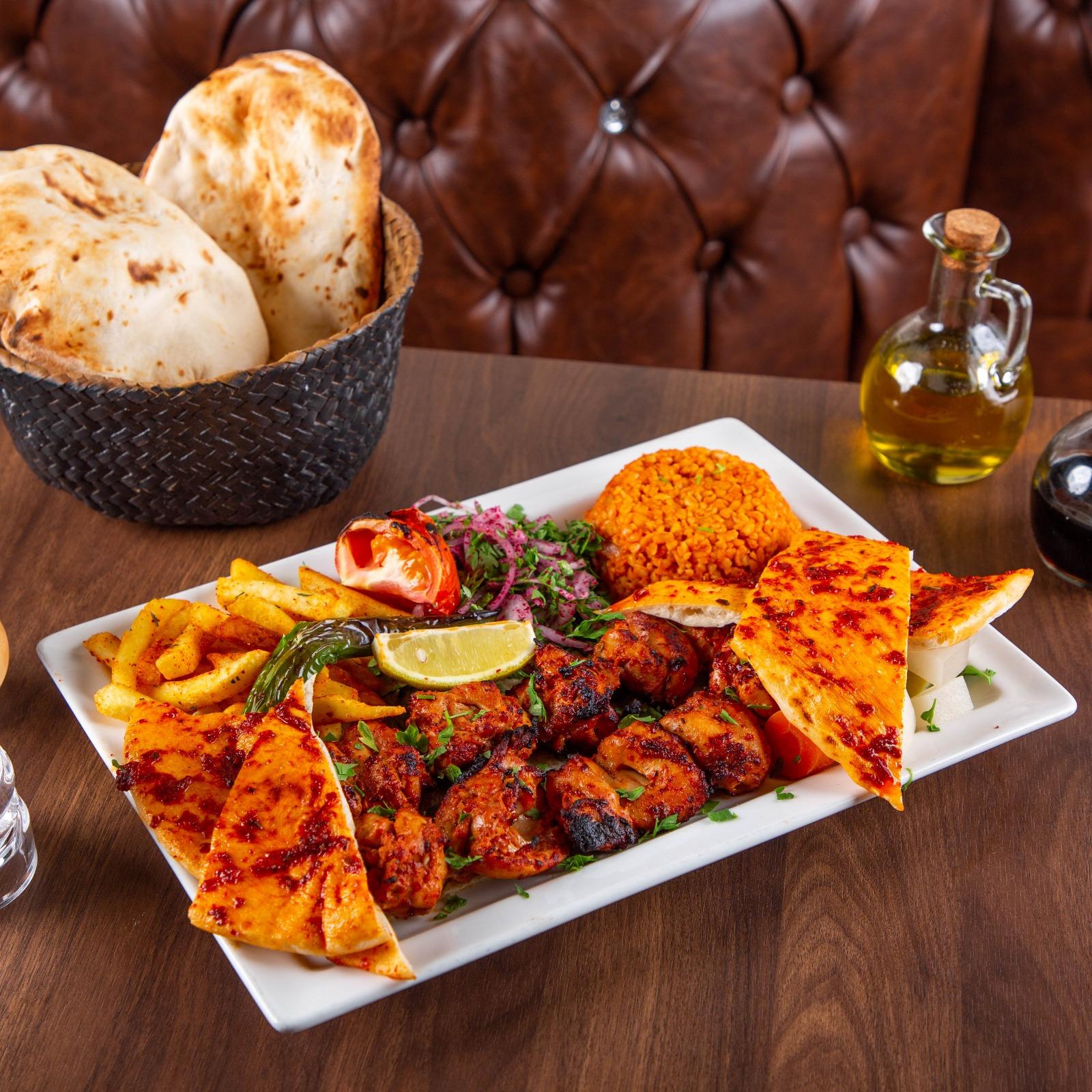 Chicken cubes marinated with grilled green chilly pepper & tomato served with french fires & bulgur