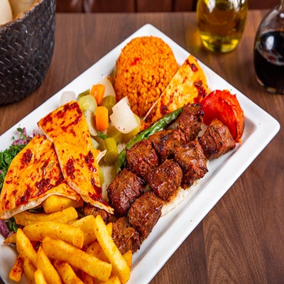 Meat cubes with grilled green chilly pepper & tomato served with french fires & bulgur