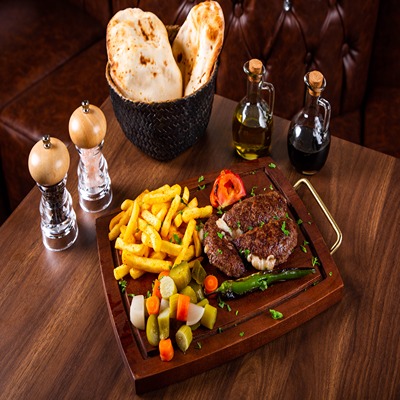 Minced meat stuffed with kashar cheese grilled green chilly pepper & tomato served with french fires & bulgur