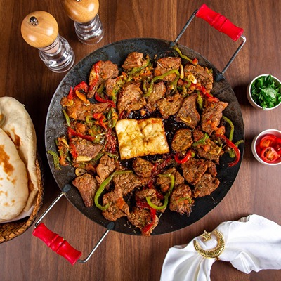 Tender pieces of meat along with onion,garlic red & green bell peppers with seasoned spices cooked on metal pan