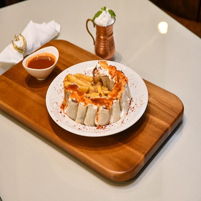 Doner meat and chıcken wrapped ın dough slıced,served frıes, tomato sauce and yoghurt